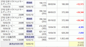 4/30結果 コメントを残す 現物のマクドナルドを一度利確。 500株 1983円 約+11万円 そして再度購入。500株 1985円 水曜日に購入したコマツ(信用)を寄りで返済。 買: 株数 :1,000 価格 :1,852 売: 価格 :1,919 +6万円 キユーピー現物を損切り。 買: 株数 :1,000 価格 :1,046 売: 価格 :1,037 -1万円 取引:信用新規買 銘柄:7832 バンダイナムコホールディングス 市場:東証 株数:2,000 価格:936