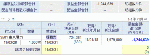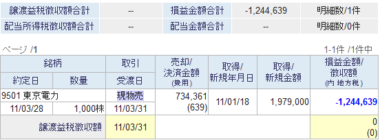 東電損切り コメントを残す 今日は2012/07/26。 去年の3/11の損切りを今になって報告します。 一時期は利益10万円出ていた。 それがあの、3.11 東北震災。 原子力問題で連日のストップ安。 株主として、仕方無い。。。 少し値が戻った(734)所で損切り。 今日の株価は120円ぐらい。 124万円のマイナス。
