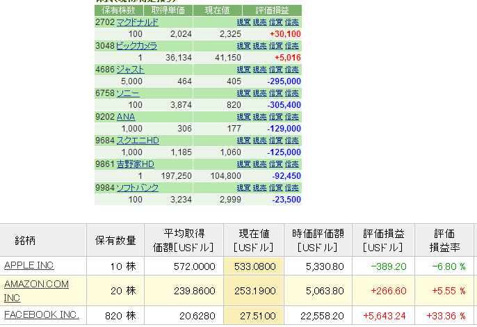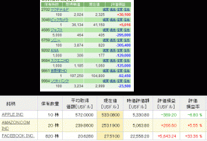 保有株update コメントを残す 連日のジャスト暴騰で、含み損が100万円越えから、30万円まで下がった。 プラ転するかな。したら欲が出てくるんだろうなぁ。。 プラ転したら、自動損切りを設定して強制的に売るようにする。 外国株はFacebookが好調だが、Appleがダメ。。。 地図アプリが改善されるまでは悪いかな。
