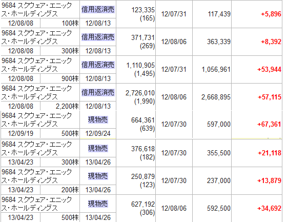 スクエニ売却 コメントを残す 日経は連日高値更新だが、自分の所有銘柄は影響なし?><; スクエニ株は2回の赤字発表後、含み損が10万円前後をウロウロ。 長期戦を確保していた矢先(昨日)、いきなりの暴騰。 そして、プラテン6万円。 赤字決算で先行き不透明ってことで処分。 これで、優待銘柄のみが残った。 株のセンスも無いことから、購入はせずにマンションの繰り上げに充てるかな。。。