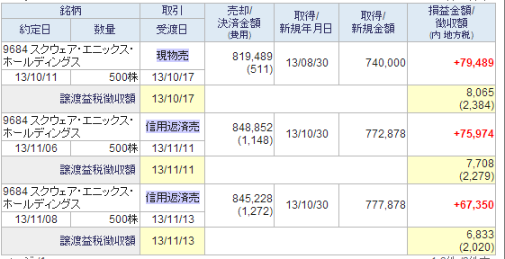 FF14:スクエニ完売 コメントを残す FF14狙いで購入した1000株のうち、残り500株も無事売却出来た。(利益6万) サプライズ好決算発表に恵まれて大きなプラスを取れた。 前回の500株と合わせて1500株の総利益は丁度20万円でした。