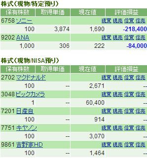 NISA開始 コメントを残す やっとNISAの審査が通過した。(1.5ヶ月?) 手持ちの銘柄の引越と、新規銘柄を購入。 計86万円かな。 気になるのが出てきたらあと1つぐらいは購入予定。(14万円以内) マクドナルド(利確、引越) ビックカメラ(利確、引越) 日産自動車(新規) キャノン(新規) 吉野家(損切、引越) 5年間放置?