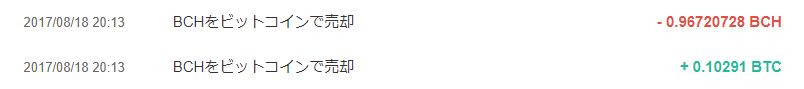 ビットコインキャッシュ売却 コメントを残す 8月のビットコイン分裂で、所有していたビットコイン1B弱に対して、 ビットコインキャッシュが同額貰えた。 最近、それを売ることが出来る事になったが、今日暴騰して5万円を超えた。 早速全て売却した。売却先はビットコイン。 約0.1Bゲットかな。 日時 : 2017-08-18 20:13:11 +0900 数量 : 0.96720728 価格 : 0.10291 BTC レート : 0.10639912 BCH/BTC