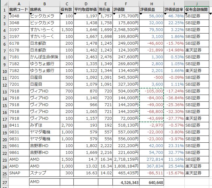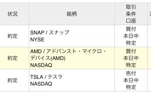 さよならテスラ株 コメントを残す 長らく所有していたテスラ株を利確。+2万ぐらい? そのまま、AMD100株を購入して丁度1000株保有へ。 残りのお金で、Snapchatをナンピン。 さらに別口座でAMDを300株所有していたが、追加で700株を購入。 合計2000株となった。AMDへの期待が大きいということだ。