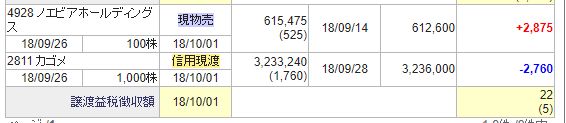 9末の優待取り コメントを残す 9末決算の優待取りを実施、2銘柄、カゴメとノエビアHD カゴメは初のクロス取引を実施。結果-3000円だが、6000円相当の優待が貰える予定。 ノエビアHDは早めに仕込んでたので、+3000円と更に優待2000円相当かな。 一応成功ですな。