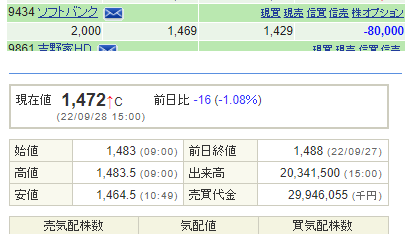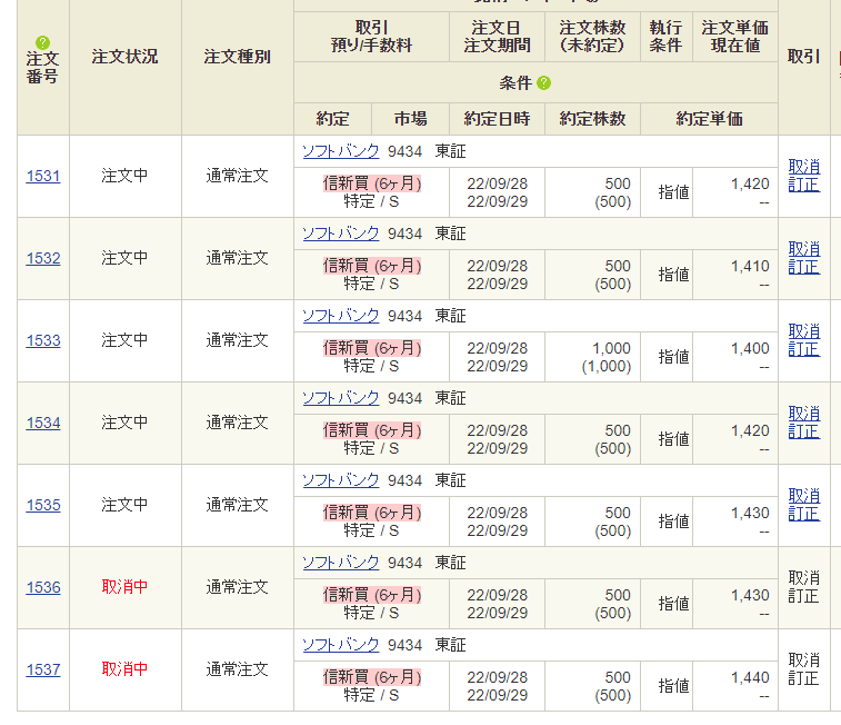 SB権利落ちに仕掛 コメントを残す 権利落ち翌日は大きく下がると見込んで買いを仕込んでみた。現状は2000株保有。これに対して信用買いを仕込んだ。さてどうなるかな。 既に1429になっていたので、1430の買い注文を外した(下2行分)。 結果: あまり下落が無くて何も買わなかった、、、以上!
