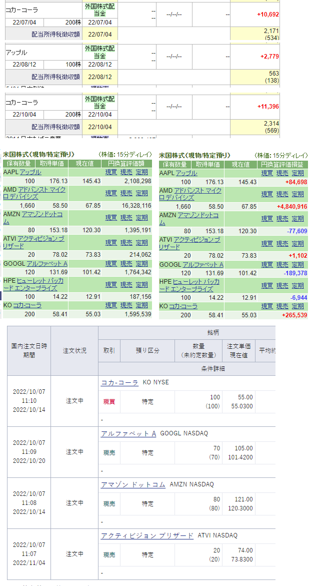 外国株見直し コメントを残す アップルとコカコーラは配当が貰えてるが、コカコーラの配当が異常に多い。 損切りも兼ねて、Amazon全部、Google半分、アクティビジョン全部を売却。コカコーラの資金にする。 まずは手持ちの資金でコカコーラを増資。