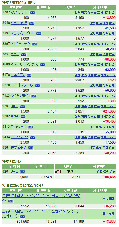 色々売却 コメントを残す 楽天証券で保有している銘柄を引越。※すかいらーく1000株が残ったままだが 先日、トリドールHDを2口購入。うどんの商品券をゲットするぞ! マクドナルド2口持っていたが、1口は利確済み。