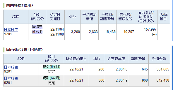 JAL3200株 利確 コメントを残す JAL所有分現物 1000株信用 11000株 本日売却 3200株本日現引 500株来週現引 500株 売却利益は15万ぐらいかな。 最終(来週)現物 2000株信用 7300株