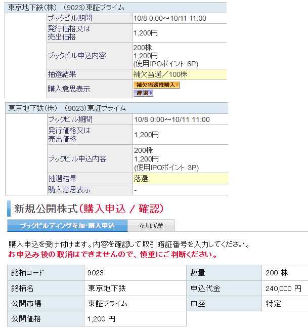 東京メトロ IPO 3口座 計6口申し込んで、3口当選した。ラッキー。